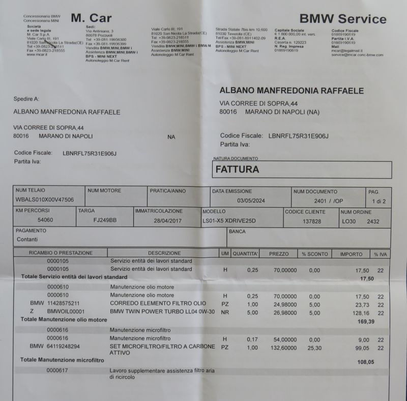 Accensione senza inserimento chiave - Airbag anteriori per guidatore e passeggero - Airbag laterali ant. per guidatore e passeggero - Airbag laterali per la testa anteriori e posteriori - Alzacristalli elettrici ant. e post. - Apertura Comfort portellone posteriore - BMW Apps - BMW Apps - BMW Emergency call - BMW TeleServices - Bagagliaio apr. in 2 parti con Softclose per la parte superiore - Barre longitudinali sul tetto nere lucide - Bracciolo anteriore regolabile con vano portaoggetti - Bracciolo posteriore - Brake Energy Regeneration - Bulloni antifurto per cerchi in lega - Cambio automatico sequenziale a 8 rapporti (Steptronic) - Cerchi in lega 20" - Chiusura centralizzata con telecomando - Chrome-Line esterno - Climatizzatore automatico con controllo a 2 zone - Computer di bordo - Control display con monitor 6,5 - Controllo dinamico della trazione (DTC) - Controllo dinamico di stabilità (DSC) - Cruise Control con funzione freno (DCC) - Disattivazione airbag passeggero - Driving Assistant - Eco PRO e pulsante selettore del feeling di guida (con modalità Eco PRO, Comfort, Sport) - Fari fendinebbia alogeni - Filtro antiparticolato DPF - Finiture lat. parabrezza in plastica nera - Freno di stazionamento elettromeccanico - Funzione Automatic Hold - Hill descent control HDC - Indicatori di direzione integrati negli specchietti - Interfaccia Bluetooth (solo trasm.vocale) e USB - Kit pronto soccorso - Luci freno a due stadi - Maniglie esterne in tinta con la carrozzeria - Modanature interne color Oxide Silver scuro opaco - Occhielli (4) di aggancio nel bagagliaio - Pacchetto fumatori - Piantone sterzo regolabile manualmente - Portabevande anteriori e posteriori (2 nella consolle centrale, 2 nel bracciolo post. centrale) - Predisposizione ISOFIX per ancoraggio seggiolini per bambini nel divano posteriore - Presa AUX-In posizionata all'interno del bracciolo anteriore - Prese da 12V: 1 nel bagagliao, 1 nella consolle posteriore e 1 nel vassoio porta-oggetti anteriore - Radio BMW Professional con lettore CD in plancia e funzione Mp3 - Schienale post. abbattibile 40:20:40 - Sedili anteriori a regolazione parzialmente elettrica - Selleria in stoffa Twill - Sensore pioggia - Sensore pressione pneumatici - Servosterzo ad assistenza variabile (Servotronic) - Sistema di Start/Stop automatico - Sistema iDrive - Tasti memoria per funzioni preferite (8 posizionati nella consolle centrale) - Tasto Start/Stop - Terminale di scarico singolo cromato, tondo, uno a sinistra e uno a destra - Trazione a quattro ruote motrici con tecnologia xDrive - Volante sportivo in pelle